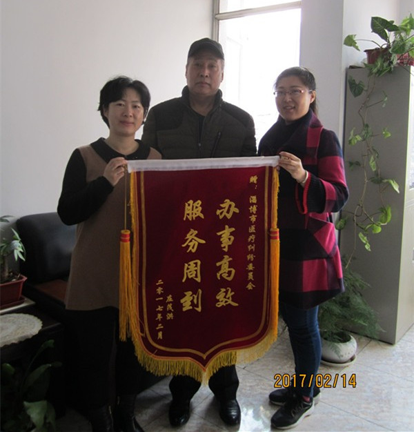2017年2月14日上午,淄博市医疗纠纷人民调解委员会收到了一面当事人送来的锦旗。“办事高效、服务周到” 八个字表达了当事人对我们工作的认可和鼓励,也将激励着我们更加努力的工作,为社会服务,为人民服务。